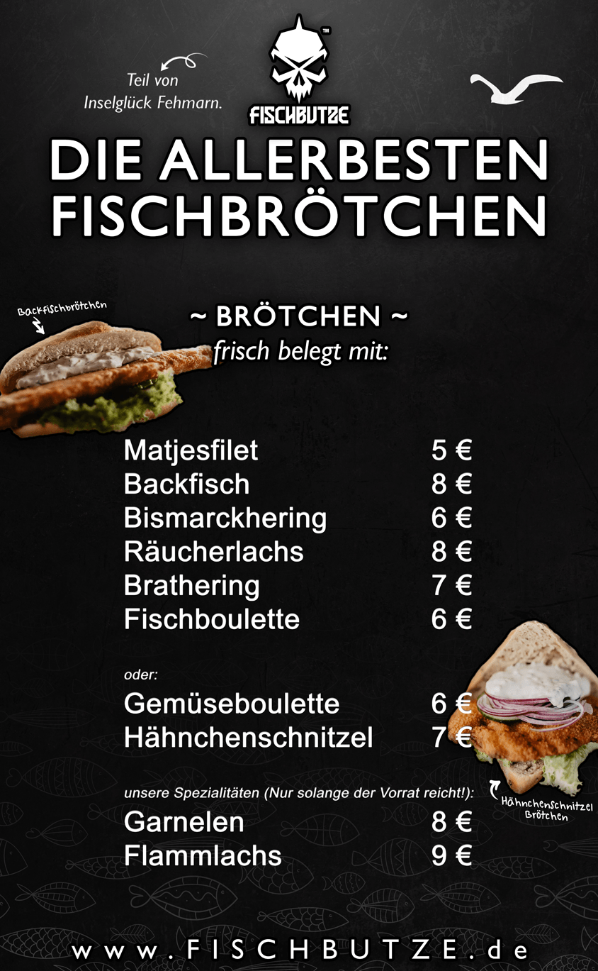 Frische Brise, salzige Luft und das beste Fischbrötchen der Insel – willkommen bei der Fischbutze! Bei uns gestaltest du dein Fischbrötchen nach Lust und Laune: von klassisch bis kreativ. Alles frisch, alles mit Liebe – genau das macht uns aus.